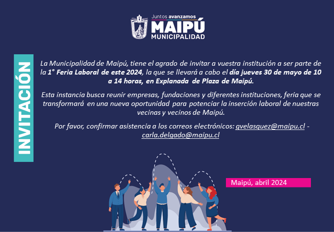 La Municipalidad de Maipú y el Servicio Nacional de Capacitación (SENCE) invitan a todas las vecinas y vecinos a ser parte de la Feria Laboral 2024, que se realizará el próximo jueves 30 de mayo, en la Explanada de la Plaza de Maipú, entre las 10 y las 14 hrs.